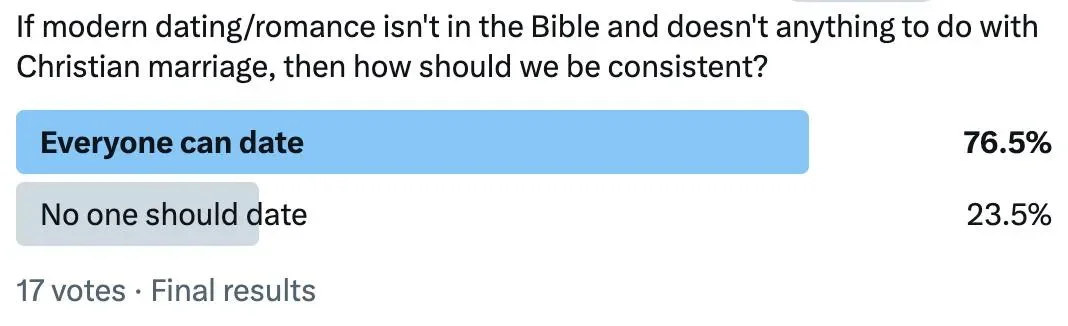 Here's a poll from X. Looks like most would allow everyone to date, if forced to choose. A number of you pushed back on the idea that modern dating/romance has no connection to Christian marriage. Let me explain.